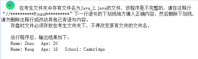 以下是Java中关于类的继承、构造方法调用及方法重写的典型题型,通过Person类和Student类(继承自Person)展示面向对象的基本特性,包含5处需要填写的空白(标记为//*********Found********):