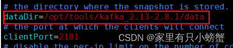 2、修改数据文件目录地址“dataDir”为/opt/tools/kafka_2.13-2.8.1/data