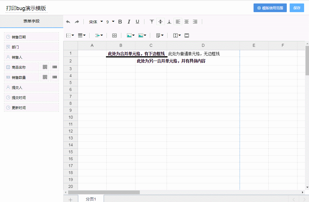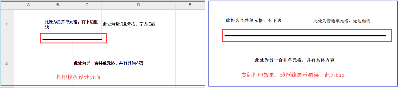 当合并单元格下面依然有合并单元格时,如果上一个合并单元格有边框,那么在打印时会出现边框溢出的情况,如下图: