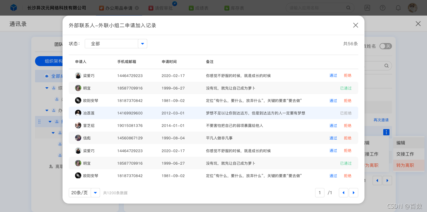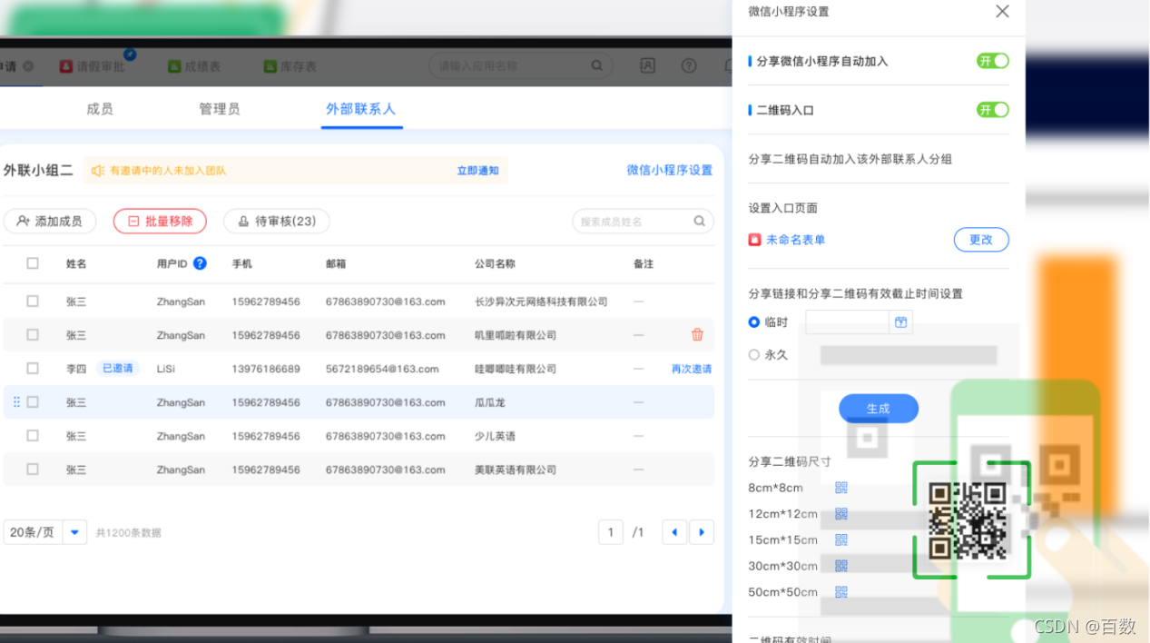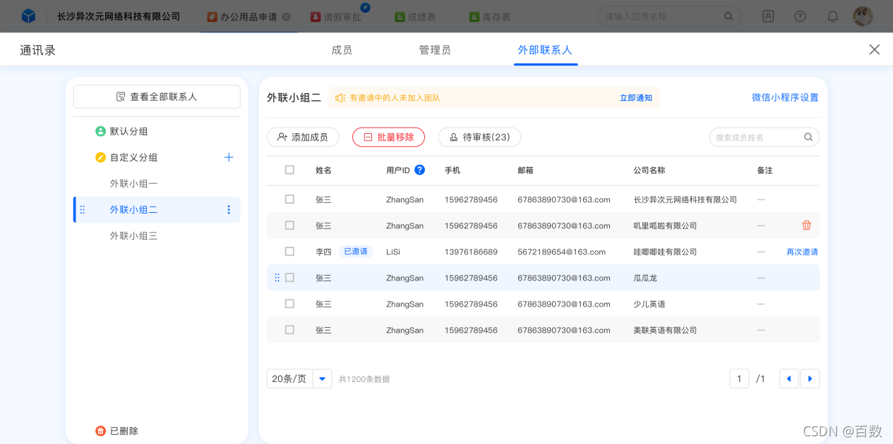 企业与供应商之间的协作,往往涉及到多家比价,了解价格波动等情况,合作的企业数量多,外部的沟通协作在百数可以十分便利地实现。在企业通讯录中可以选择添加外部联系人,通过外部通讯录进行人员权限管理,例如后台数据查看、使用等等。方便权限设置管理,减少不必要的申请步骤。