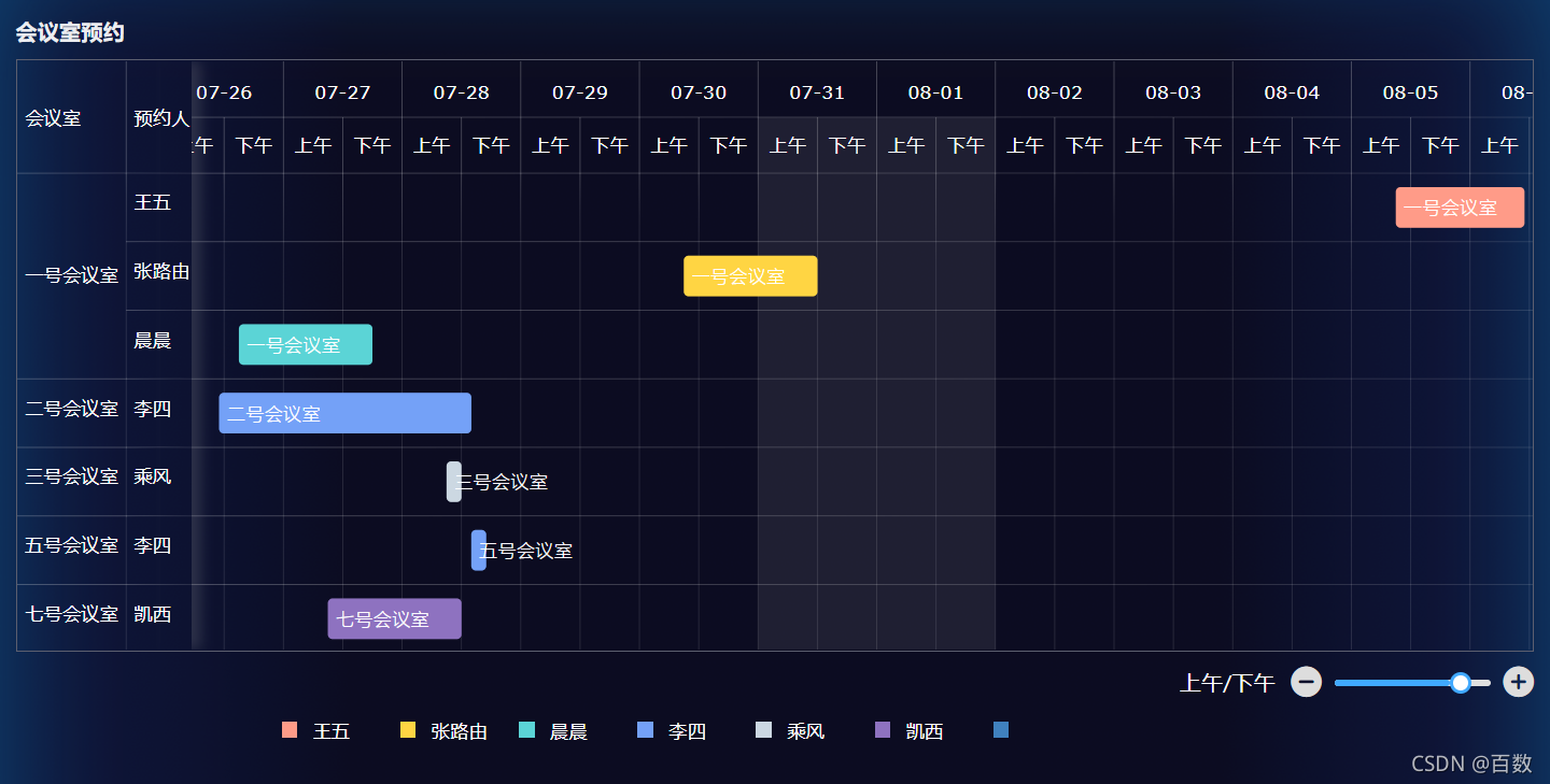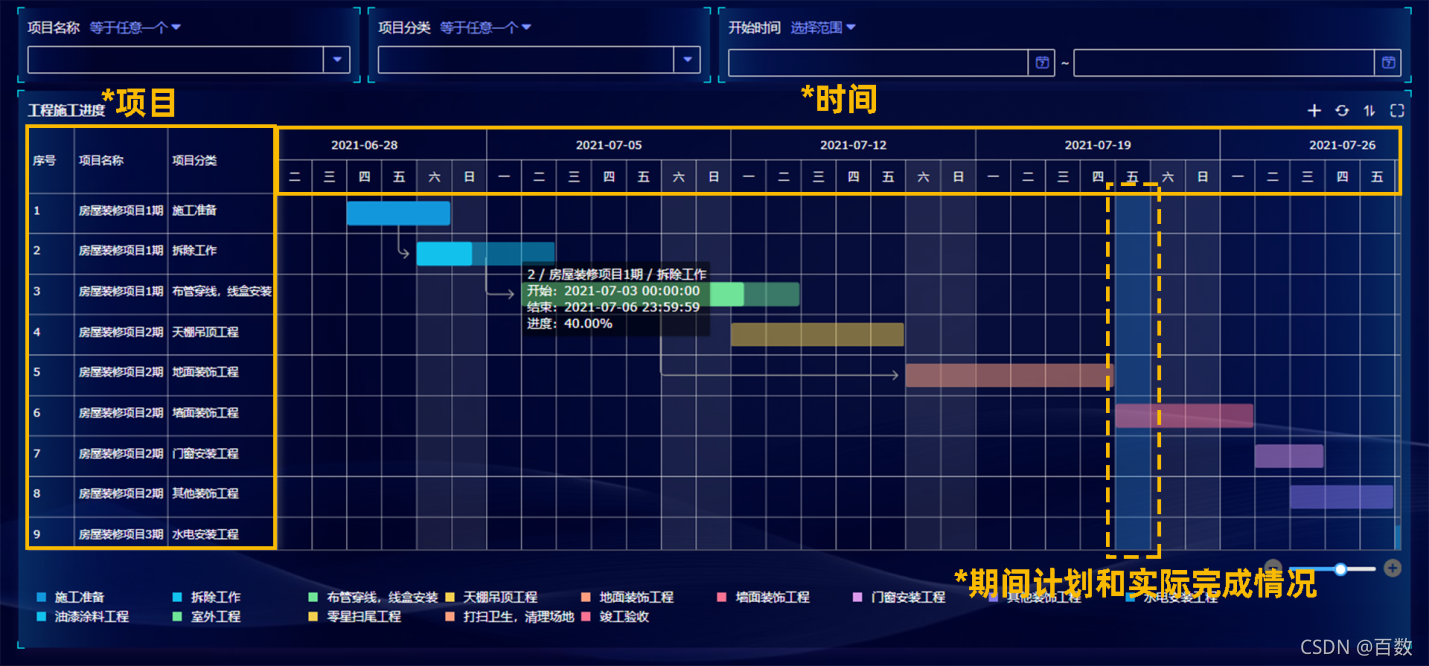 甘特图是将任务与时间联系起来的一种图表形式,以图示来显示项目、进度、和其他时间相关的系统进展的内在关系,随着时间进展的情况,直观表明计划何时进行、进展与要求的对比。除此之外,甘特图还可以应用在各类预约场景的数据展示,如会议室预约情况、课程预约情况等。