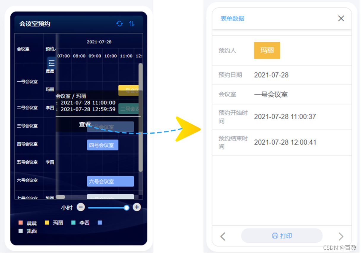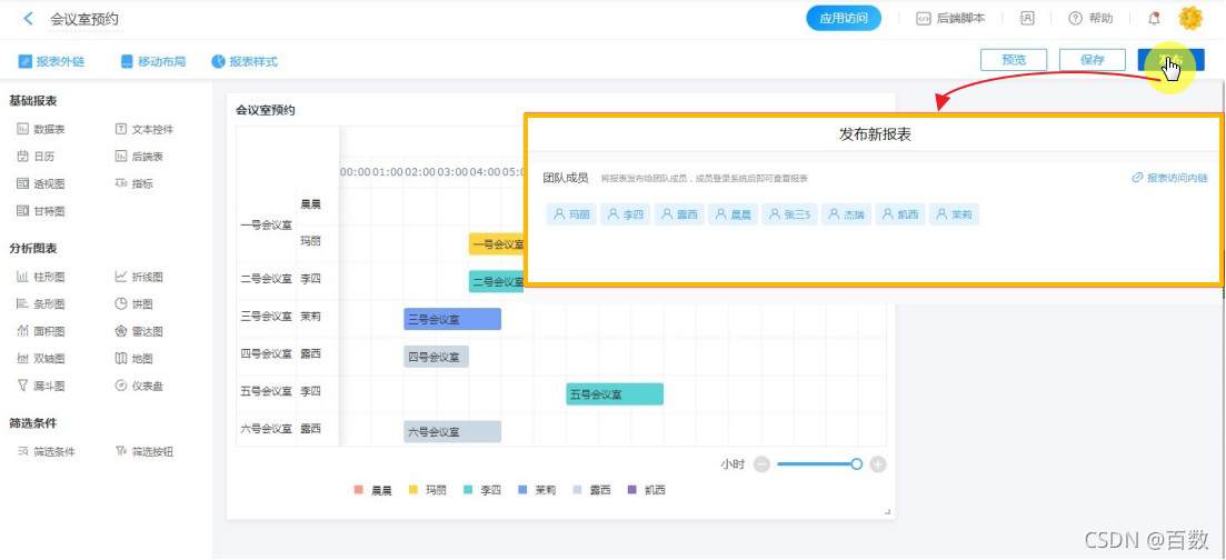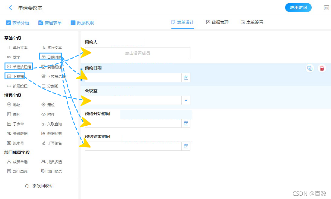 设计如图所示的会议室预约表单,发布给成员填报表单来进行会议室预约。