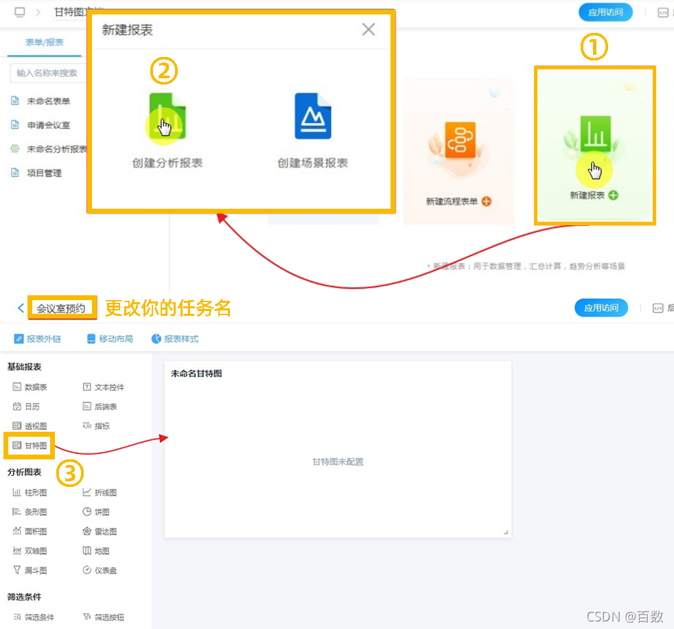 在分析报表组件中拖拽创建甘特图。