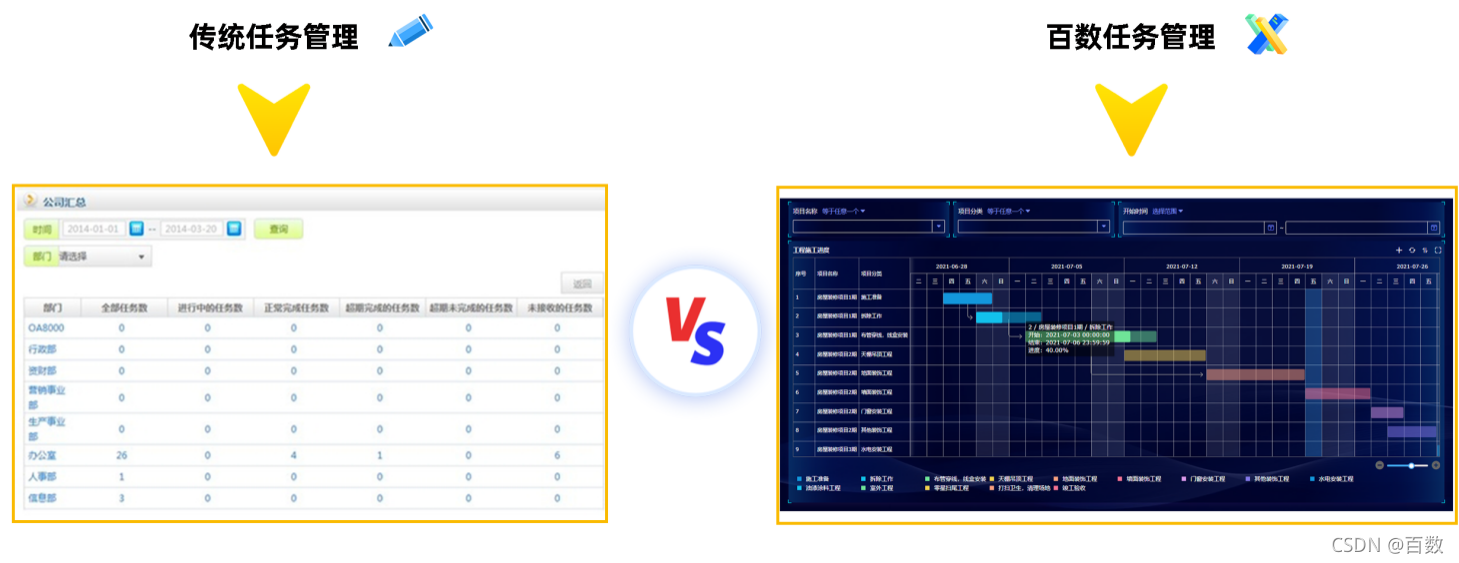 而利用百数的甘特图做任务管理可以将业务规划和落地执行联系起来,完成从上到下的计划分派、进度监控和从下至上的进度反馈,帮助管理者弄清项目的剩余任务,评估工作进度。