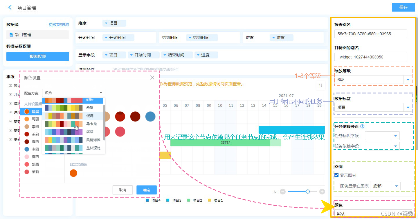 进行甘特图的美化,在右侧功能配置面板上可以对甘特图设置【缩放等级】*1-8级,根据任务处理周期,可按年份——小时的八种时间跨度查看视图、【数据标签】、【图例】、【颜色样式】等让甘特图进度条的比例达到最佳阅读效果。