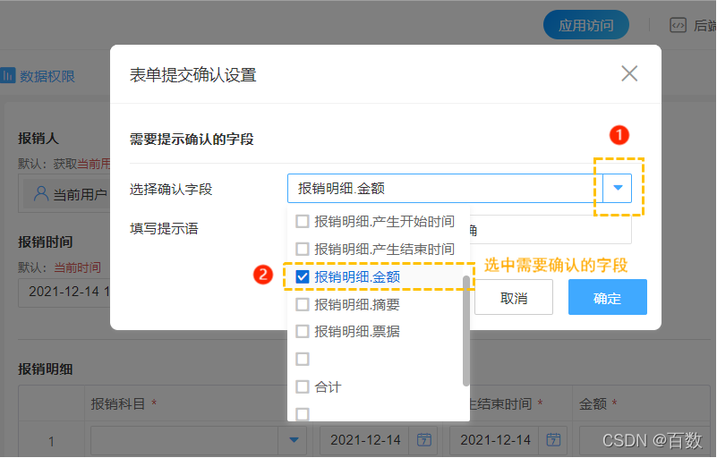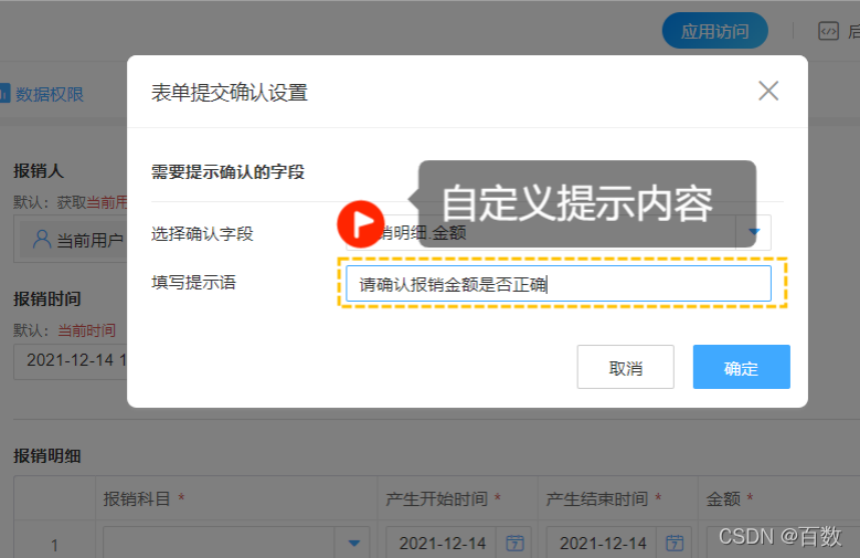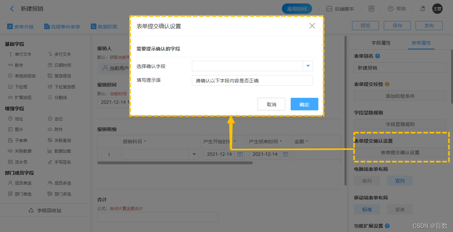 在百数,表单设计页面>>表单属性>>使用表单提交确认设置即可实现自定义提交提示的功能: