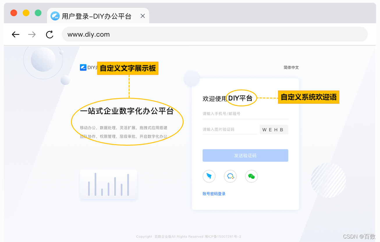 支持用户自由设计登录注册界面的文字展示板:[用户可在此处填入企业文化/企业通知..]以及系统欢迎语:[用户可在此处填入企业名称/slogan..],满足用户行业多样性与自由度;也可以根据需求,自主设置展示/隐藏文字展示版。
