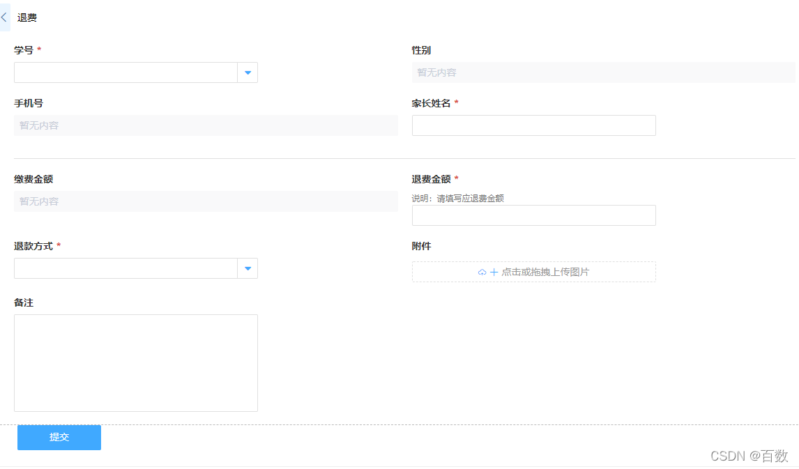 用于登记学生退费情况,包括退费方式、退费金额、附件等明细证明。