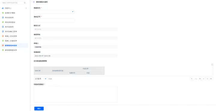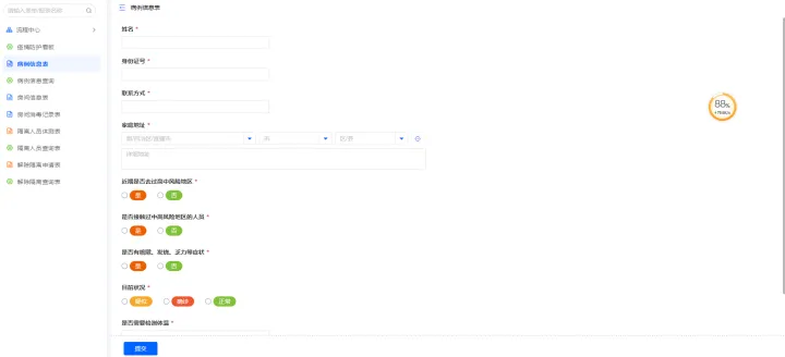 病例信息表主要是记录在酒店隔离的病例的基本信息及症状信息,便于前线的医生第一时间了解病例的基本情况从而进行统一化管理。
