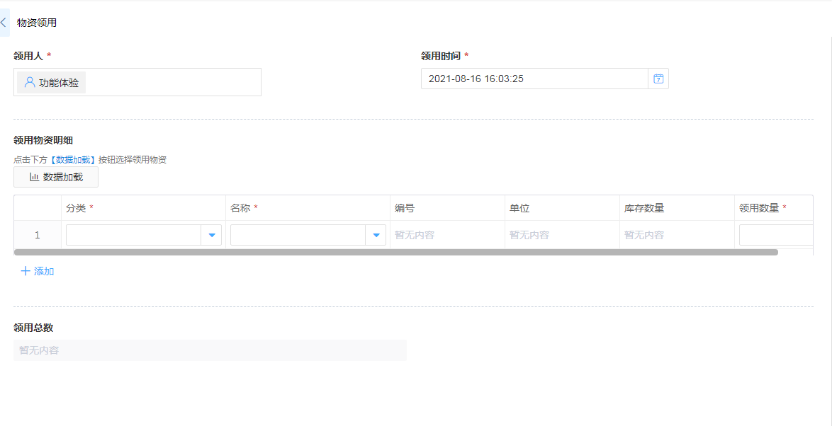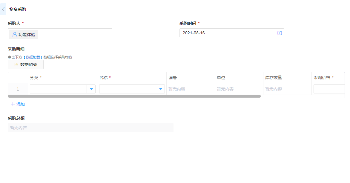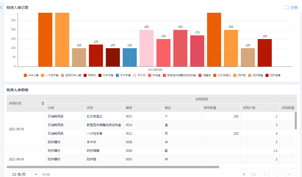 物资填报顾名思义就是将现有所有的物资填入系统,然后系统可以对其进行分类与统计等。抗疫物资管理系统中的物资填报划分还特详细,分为物资采购、物资领用、物资归还。