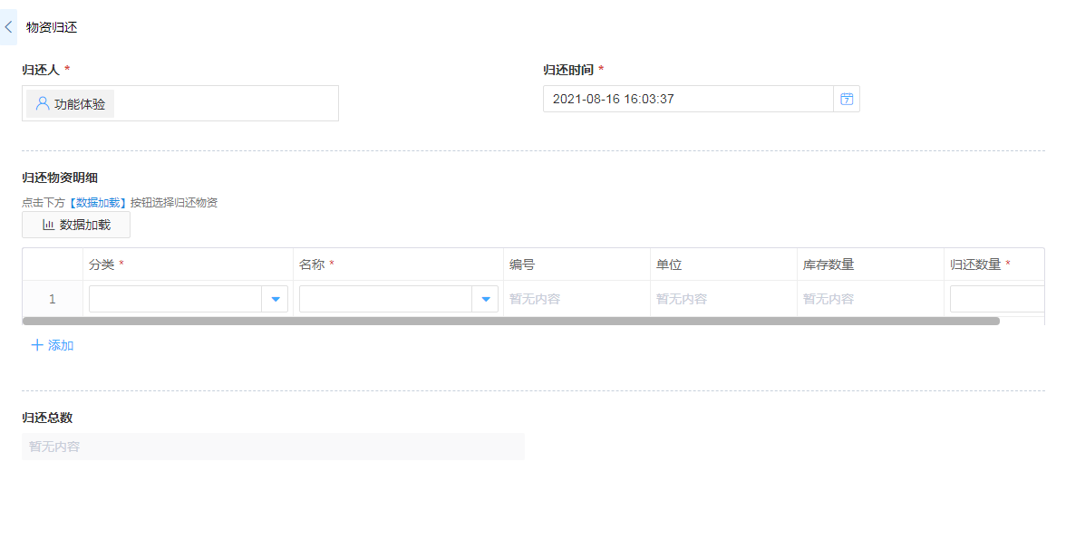 物资归还通常是将相关的物资归还后进行登记,以往采取的方式是人工进行表格登记,简单的同时却也暴露了缺点。例如:效率低下、信息储存不方便等。而这里的物资归还采用云端存储、手机或者电脑提交领用,可以快速的实现物资自动记录管理,提高了工作效率。
