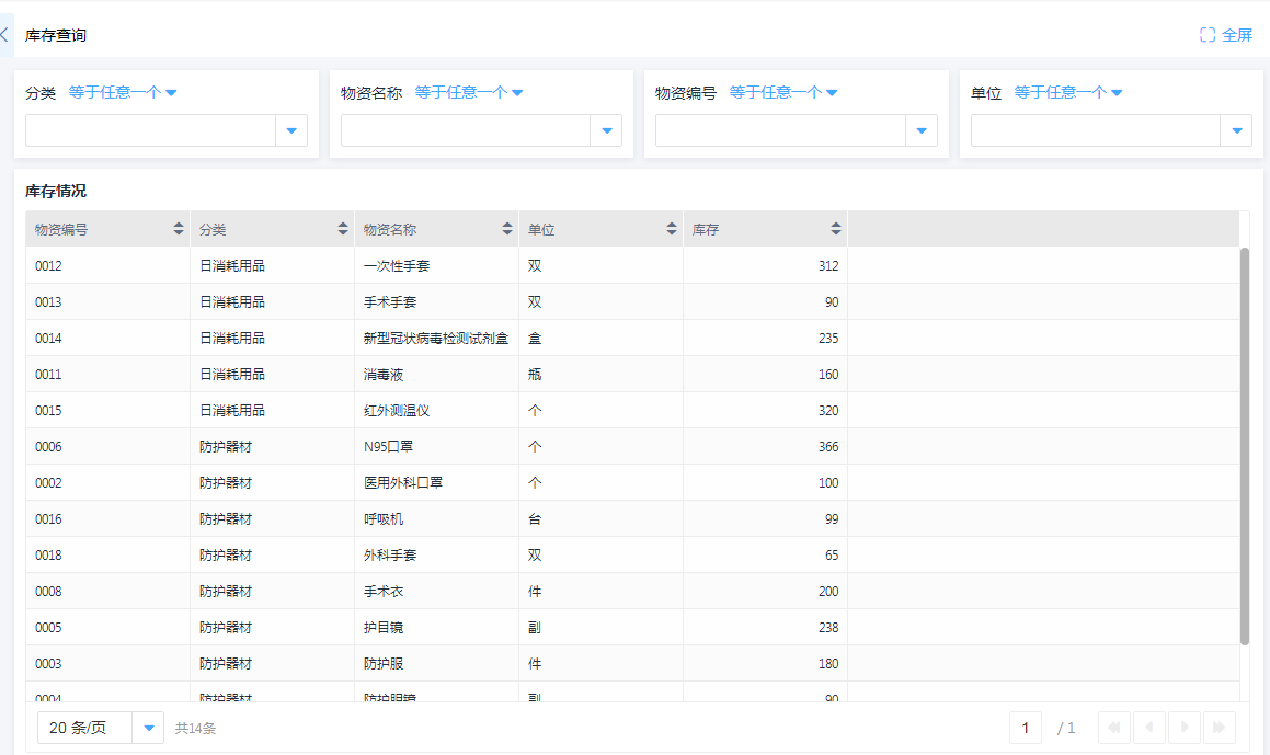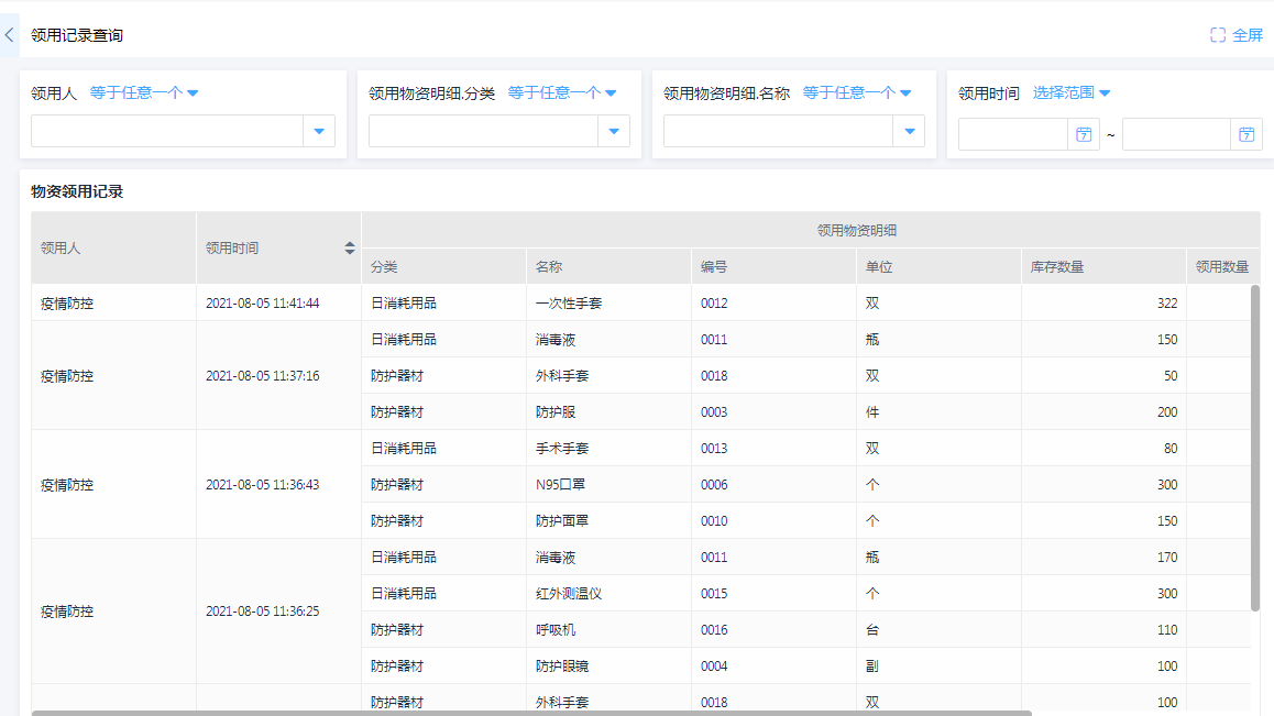 物资查询这一块主要是要将所有录入进去的物资形成了表单化,便于管理者可以一目了然进行物资的分配、管理、清点等工作。物资查询主要是分为:库存查询、物资入库记录、领用记录查询、归还记录查询。