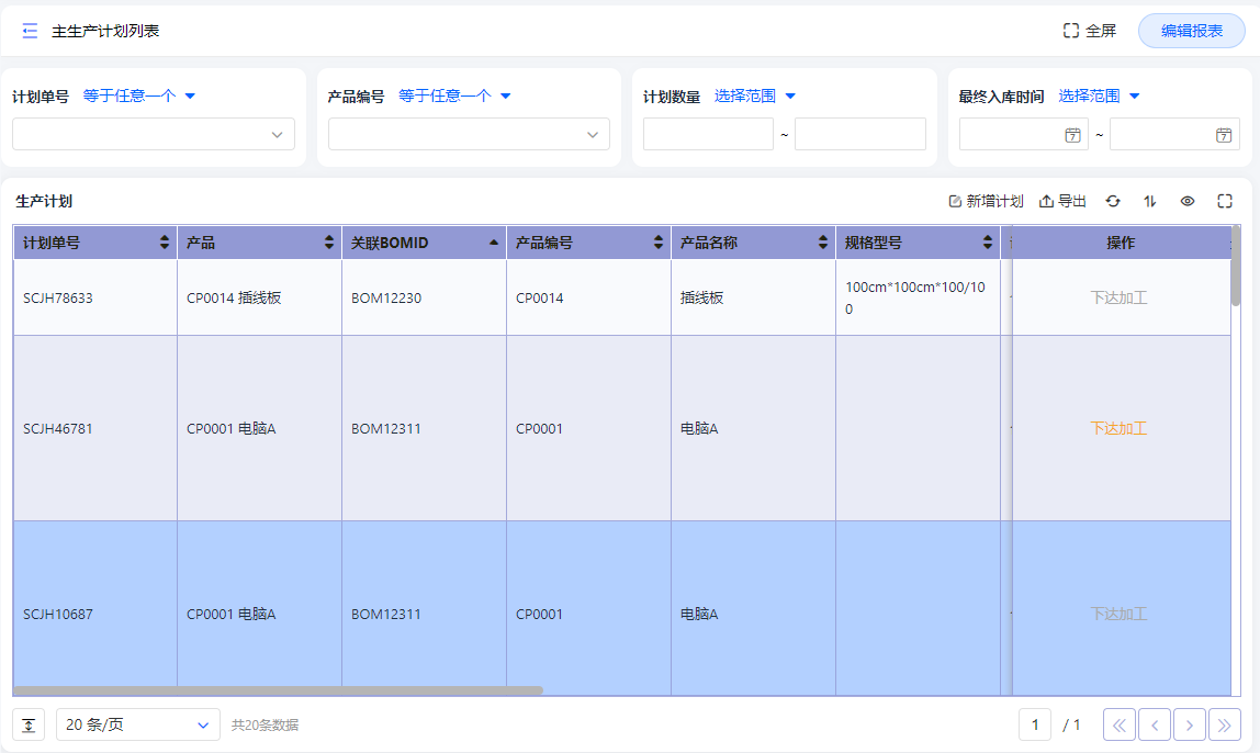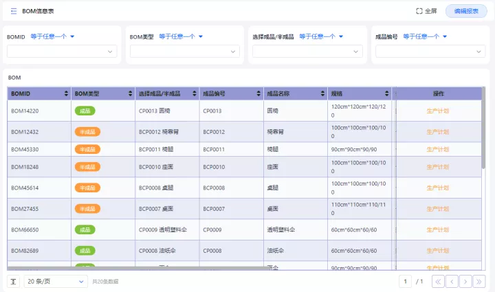 BOM信息表展示所有产品结构清单的信息数据,可在此报表发起生产计划。