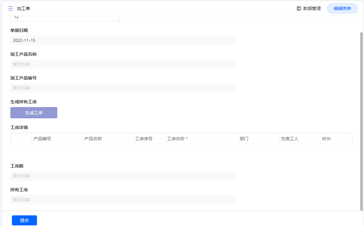 在主生产计划列表中下达加工后,加工单列表可展示出所有加工单的信息,加工单需对各个工序进行完成的操作才能提交结束加工单的流程,加工单进行的同时可进行领料,领料后对加工单各工序进行完成操作,结束加工流程,发起质检流程对各工序进行成品的质检,对各个工序进行完成质检的操作后结束质检流程,最后再是操作生产入库。