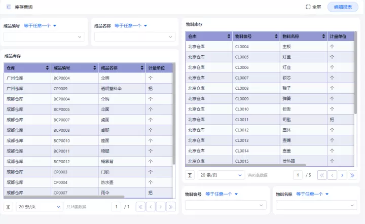 库存查询可查看产品及物料的库存情况,生产入库是在成品入库时操作的表单,物料采购入库是物料入库时操作的表单。