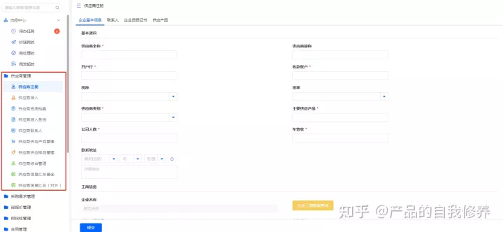 供应商管理主要包含为可注册、提交、修改自己的基本信息及工商信息,上传资质档案、管理产品及样品信息;企业对供应商是否成为合格供应商或淘汰供应商进行准入流程的审批。