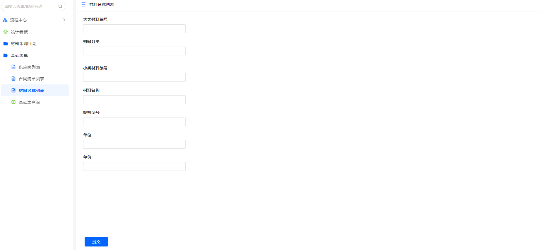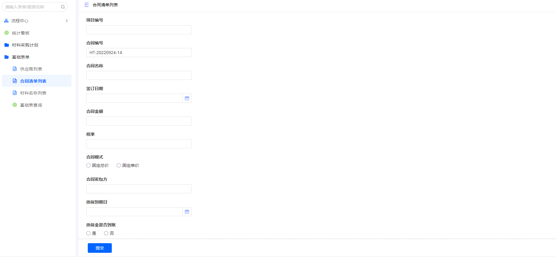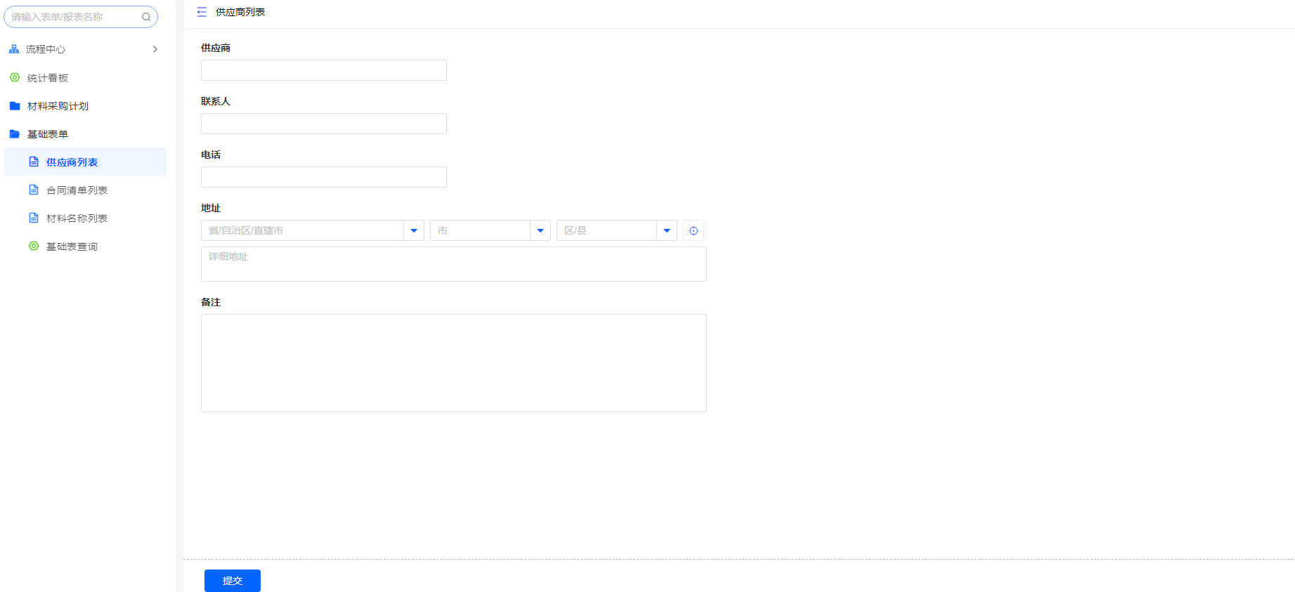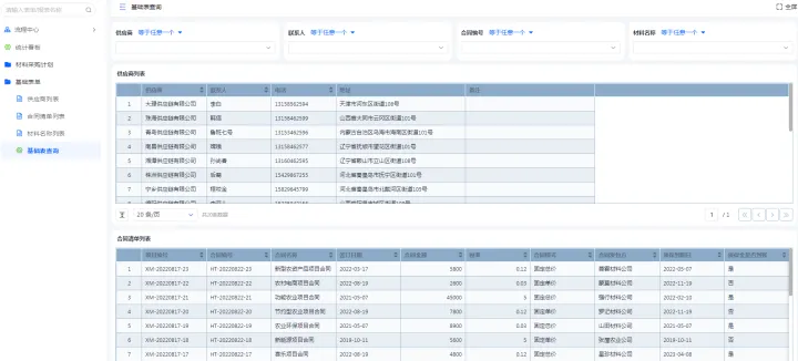 基础表单则主要是对供应商、合同清单、材料清单的基础信息管理。