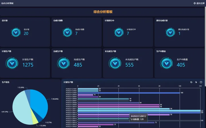 该分析报表里展示的是所有生产过程中的分析数据,包括计划总数、完成数、未完成数等数据。