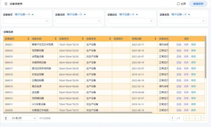 设备信息表报表里展示的是所有生产设备、非生产设备信息,可对设备进行巡检、保养、报修、新增等操作。