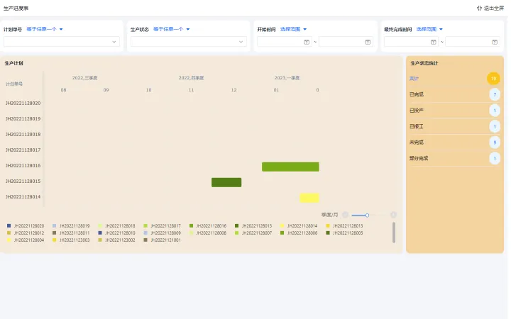 该报表展示所有生产计划信息及其状态,进度表展示的是生产计划的生产进度信息。