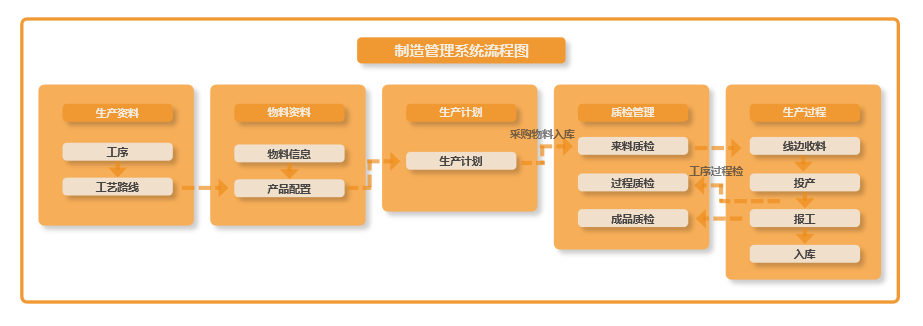 物料信息存储所有物料、成品、半成品、零件等物料信息。在产品配置中,提前配置好用来配置生产成品的BOM、工艺路线、过程检、来料检、成品检等信息,生产计划可自动生成生产耗材、工艺工序、质检流程等信息。