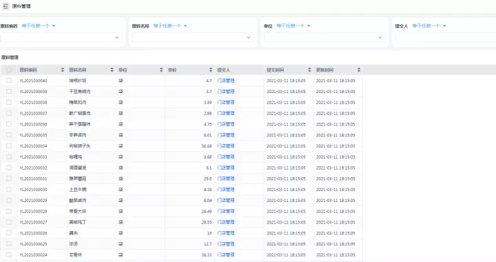 1、原料管理:可以进行查看所有的原料名称以及原料价格等等一系列的数据汇总信息。