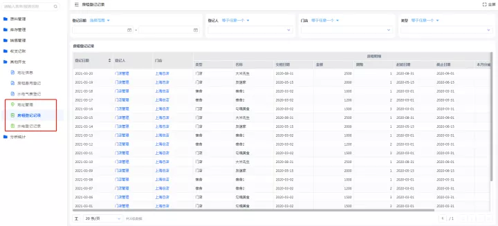 2、管理员可以根据相应的报表进行查看所有门店的地址信息、房租费用信息、水电气费;
