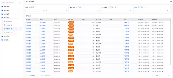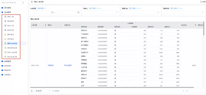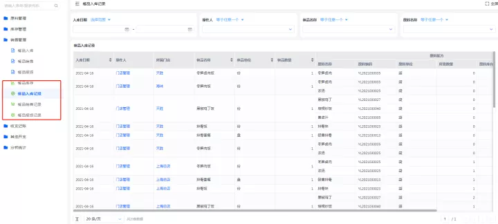 2、可以进行查看所有原料和物料的出库、入库、报损的所有数据记录。