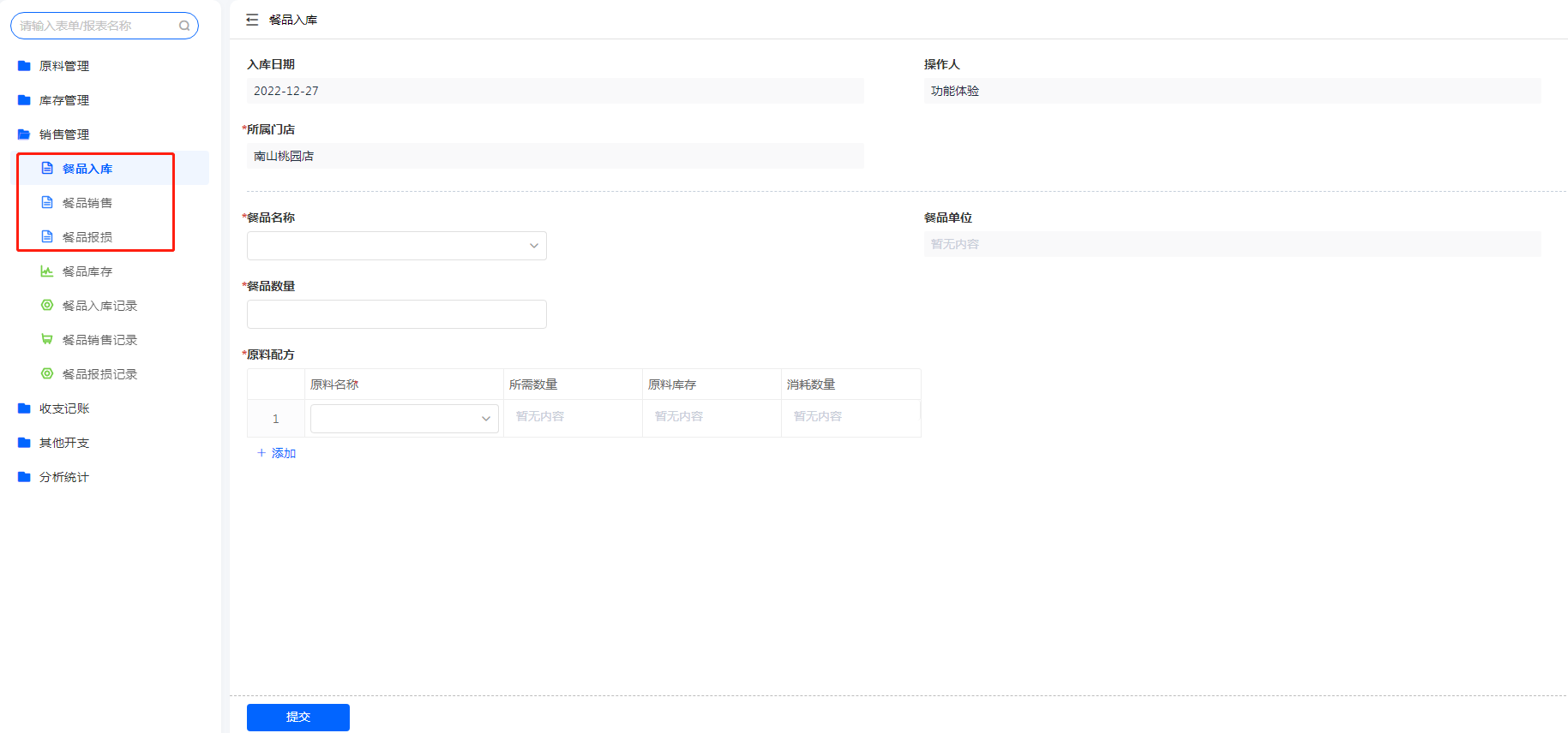 1、可以进行登记餐品的入库以及餐品销售情况和报损情况。