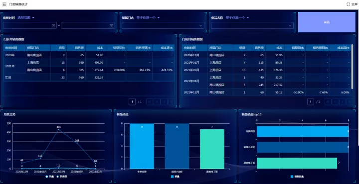 2、门店销售统计:主要针对于门店年销售数据、门店月销售数据、月度走势、餐品销量、餐品销量top10、餐品销售占比、日走势等一系列数据分析汇总。