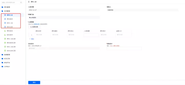 1、主要针对原料和物料,出库、入库、报损情况来进行登记。