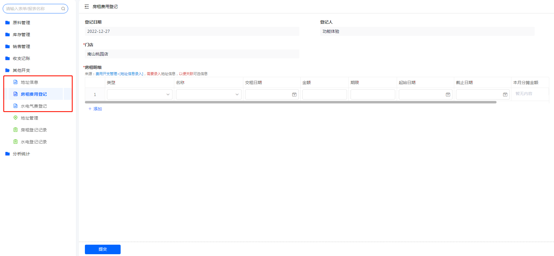 1、各个门店管理可录入门店的地址信息、房租费用登记、水电气费登记;