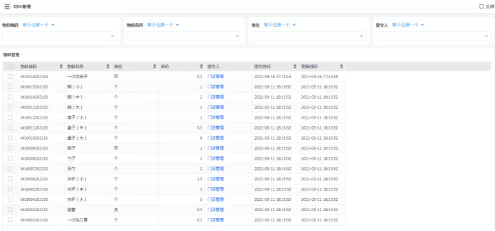 2、物料管理:可以进行查看所有的物料名称以及物料价格等等一系列的数据汇总信息。