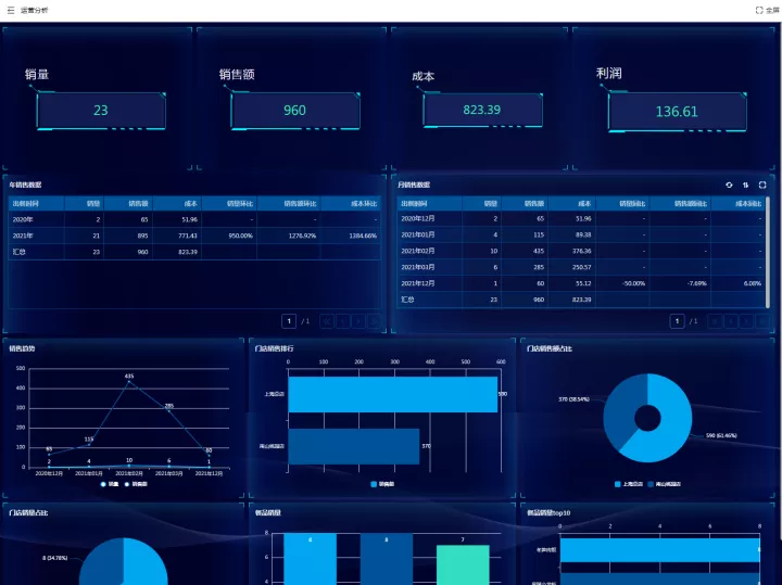 1、运营分析:主要针对于查看销量、销售额、成本、利润、年销售数据、月销售数据、销售趋势、门店销售排行、门店销售额占比、餐品销量、餐品销量top10等一系列数据分析汇总。