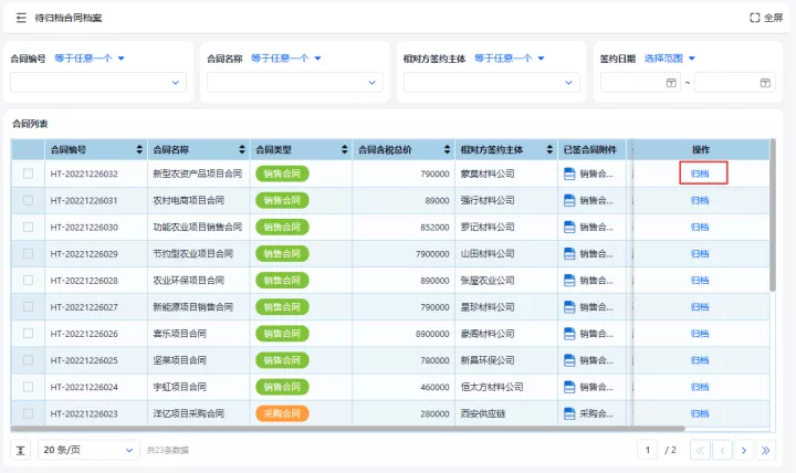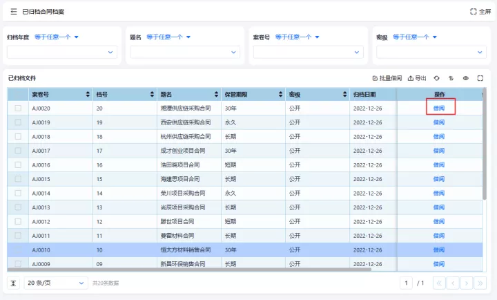 已归档合同档案报表展示的是已归档的合同档案,可进行合同借阅操作。