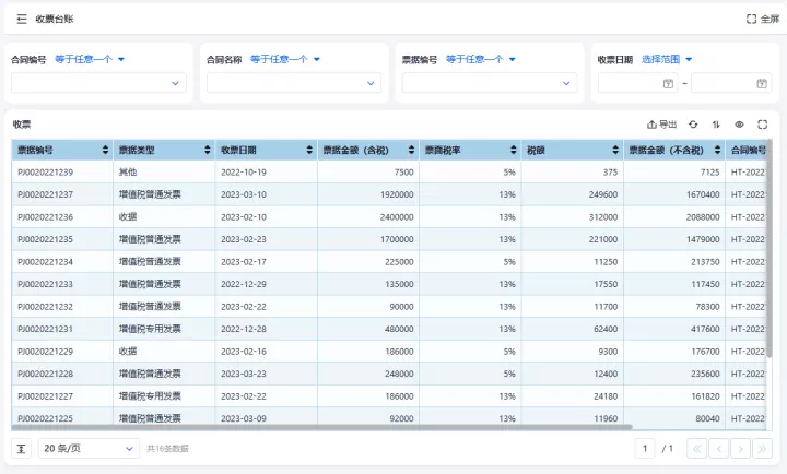 收票台账及开票台账报表里面展示所有收发票的记录。