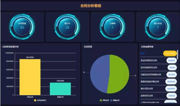 该分析报表里展示的是所有合同的分析数据,包括合同总数、履约中、已解除合同数量等数据。
