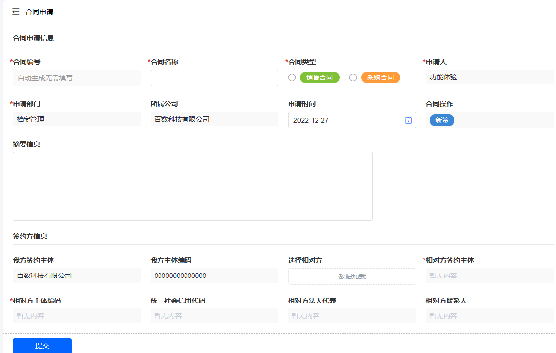 该流程表单用于合同的申请,填入合同基本信息、签约方信息、合同模板提交审核至签约。