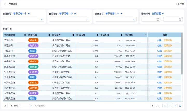 付款计划展示所有采购合同的付款计划,在此报表可做付款和申请延期付款的操作。