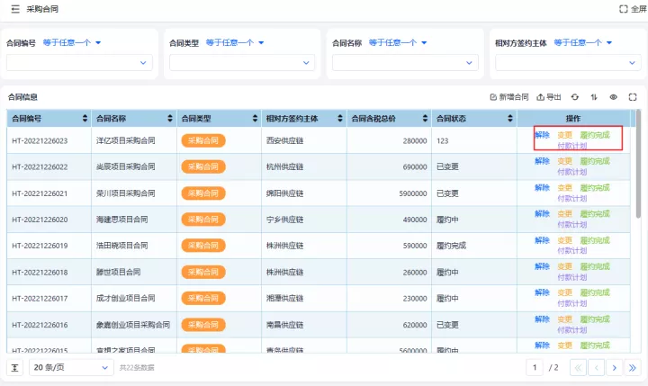 将合同信息分为采购合同和销售合同两个报表展示,在对应报表里可进行对合同的解除、变更、履行完成、新增收付款计划操作。