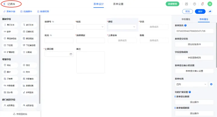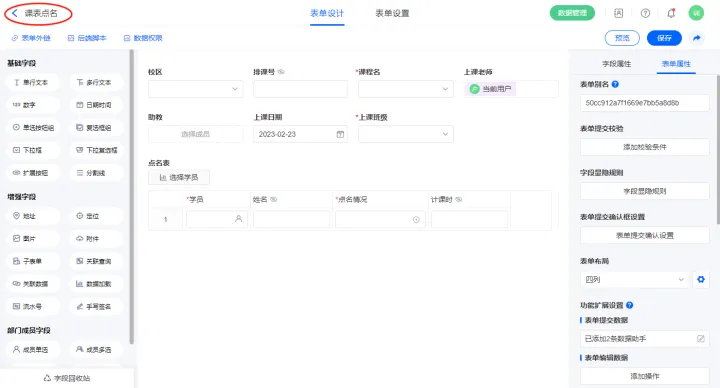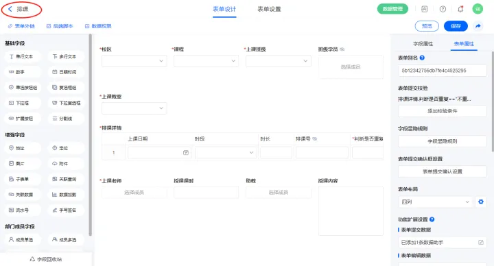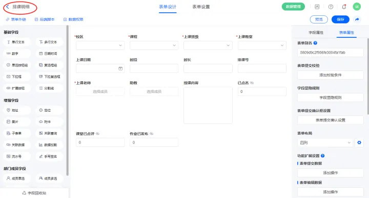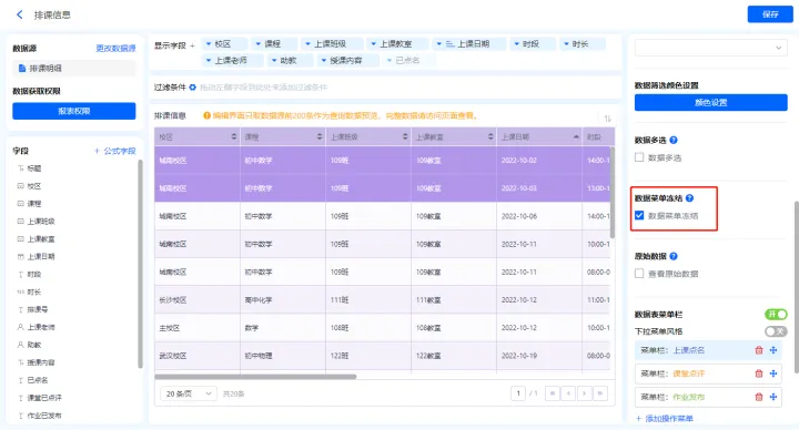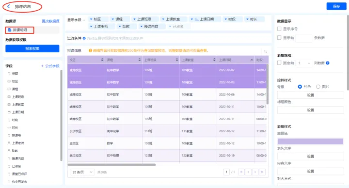 1)新增【课堂信息表】报表,用基础报表【数据表】展示数据源为表单【排课明细】的数据;
