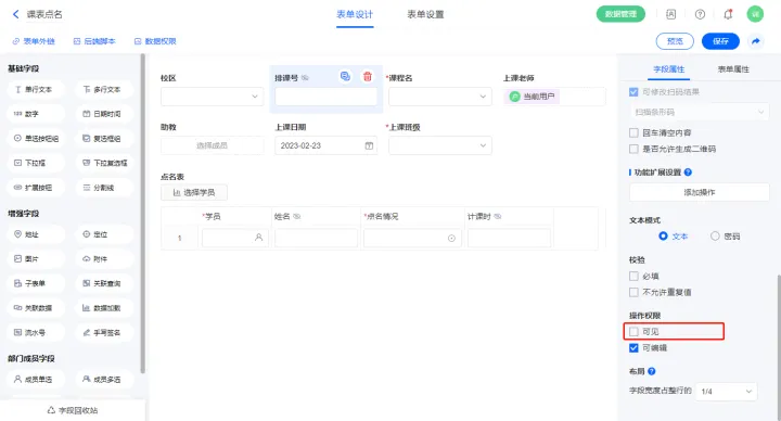 【点名表.姓名】字段,默认值选择公式编辑,如图设置公式,并设置操作权限为不可见;