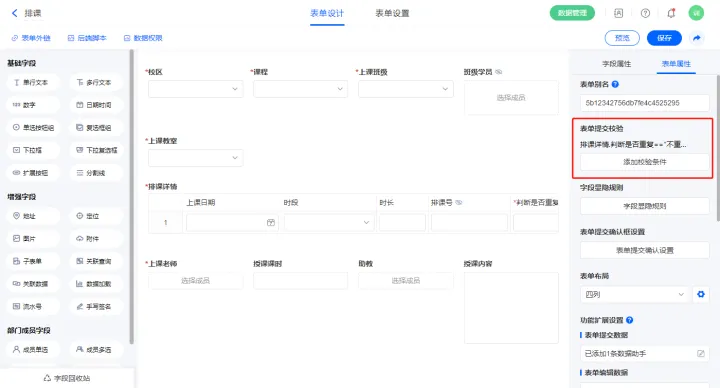 当公式“排课详情.判断是否重复=="不重复"”不满足提交时报“该时段已排课!”提示;
