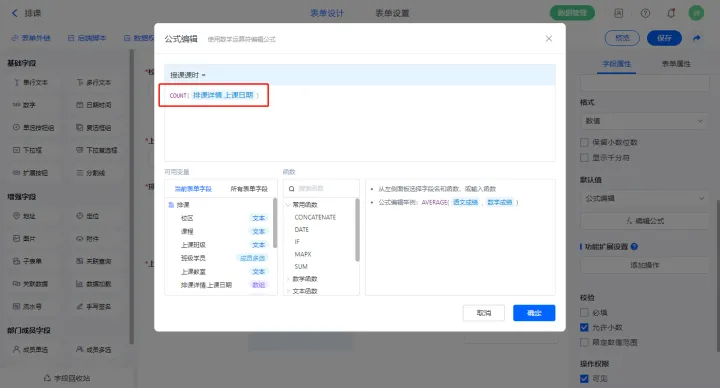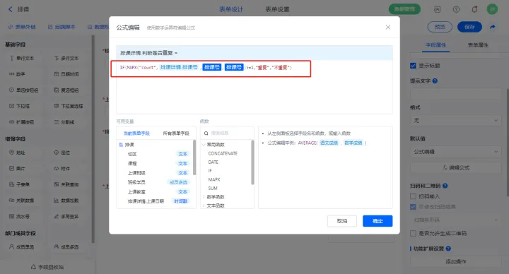 【排课详情.判断是否重复】字段,默认值选择公式编辑,如图设置公式,该字段为不可见字段;