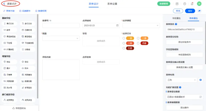 【课堂点评】的菜单栏,操作模式设置为弹出表单【课堂点评】;