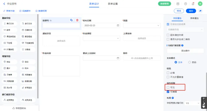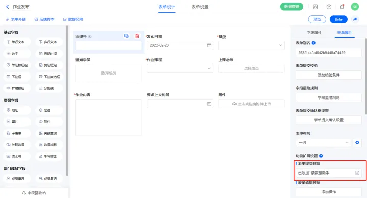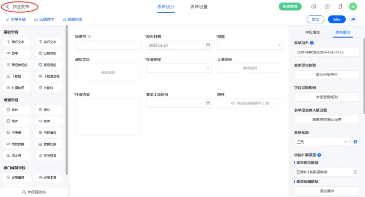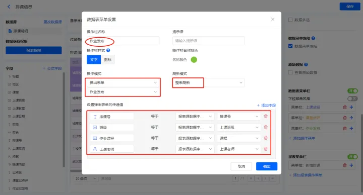 【作业发布】的菜单栏,操作模式设置为弹出表单【作业发布】;