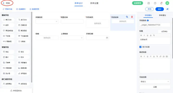 1)【班级学员】字段,设置默认值为数据联动,设置联动条件及联动字段,该字段为不可见字段;