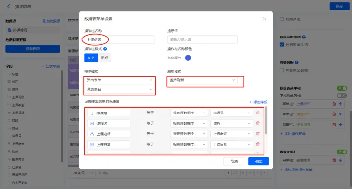 【上课点名】的菜单栏,操作模式设置为弹出表单【课表点名】;