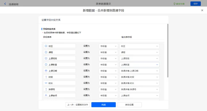 新增新增数据的执行动作,选择目标表单【排课明细】,对应赋值字段,设置好点击【完成】并保存该数据助手;