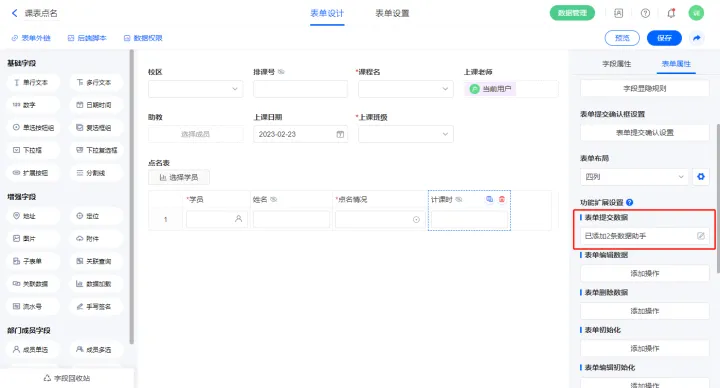 2)表单提交设置1条数据助手,名称为修改课堂状态;